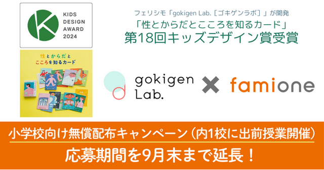 「子どもを願うすべての人によりそい 幸せな人生を歩める社会をつくる」をビジョンに掲げ、法人の従業員向け福利厚生や自治体の住民向け支援を行うヘルスケアサポートサービス「ファミワン」 https://famione.com/benefit/ などを展開する株式会社ファミワン(本社:東京都渋谷区、代表取締役:石川勇介)は、株式会社フェリシモ(本社:兵庫県神戸市、代表取締役社長:矢崎和彦)が展開する、「gokigen Lab.[ゴキゲンラボ]」(以下「ごきげんラボ」)と共同で、性教育ツール「性とからだとこころを知るカード」を全国の小学校を対象に配布キャンペーンを行っており、「性とからだとこころを知るカード」が第18回キッズデザイン賞を受賞したことから、当キャンペーンの応募期間を2024年9月30日(月)までに延長決定いたしました。 ▼特設サイト:https://felissimo.famione.com/