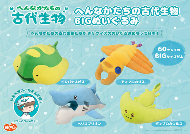 絵本作家・イラストレーター「こた」の絵本『わくわく科学ずかん古生代水族館』より、人気の古代生物4種をアソートした「へんなかたちの古代生物」のBIGぬいぐるみ。