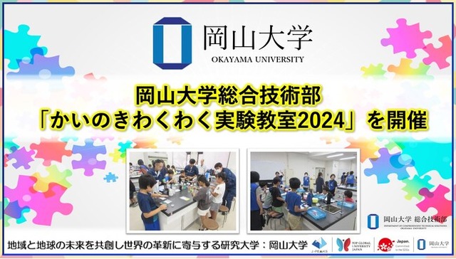 国立大学法人岡山大学(本部:岡山市北区、学長:那須保友)の技術統括監理本部を構成する組織のひとつである総合技術部は、2024年8月26日に本学の学童保育施設「かいのき児童クラブ」の児童らを対象に「かいのきわくわく実験教室2024」を、本学津島キャンパスで開催しました。