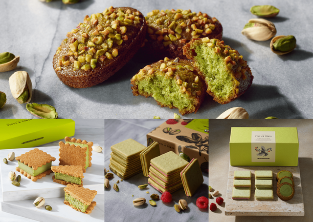 画像上:ガトー ピスタチオ、画像左下:サブレサンドピスターシュ、画像中央下:ピスタチオサンド アソート、画像右下:ピスタチオギフトBOX