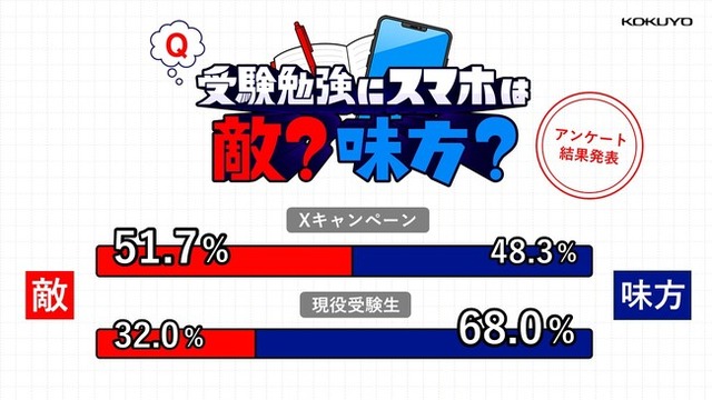 コクヨ株式会社(本社:大阪市/社長:黒田 英邦)は、2024年8月21日(水)から2024年8月30日(金)までの間で、「受験勉強にスマホは敵?味方?Xキャンペーン」を実施しました。その結果、受験勉強にスマホは「味方」と思う人が48.3%、受験勉強にスマートフォン(以下、スマホ)は「敵」と思う人が51.7%という結果となり、僅差で「敵派=スマ勉活用しない派」が優勢でした。