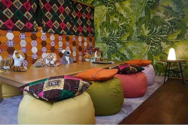 元々はジャングルドームと呼ばれる、アニマルをイメージしたドラム缶風呂がついた客室を大人数用に大変身しております。