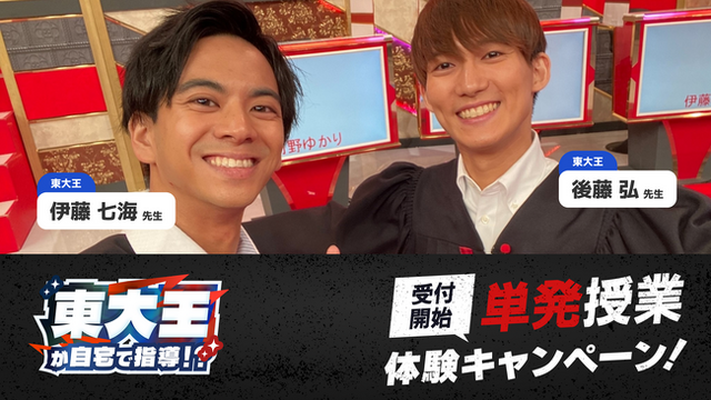 本キャンペーンでは、クイズ番組「東大王」に出演し、その知性と人柄で人気を集めているメンバー(伊藤七海・後藤弘)が、直接ご自宅に訪問し、マンツーマンで90分の授業を行います。