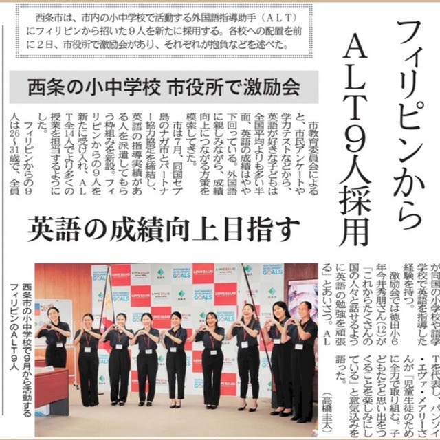 2024年9月から、愛媛県初となる西条市の小中学校に9名のフィリピン人英語講師の派遣が開始されました。