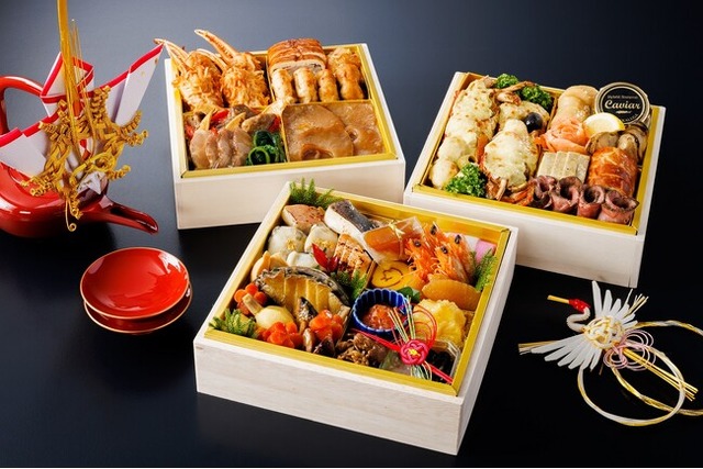 限定10個の「特撰和洋中おせち 三段重」は、壱ノ重に車海老や鮑、松茸などを美しく仕立てた和食、弐ノ重にはオマール海老のグラタンや米沢牛のロースト、キャビアなどを盛り込んだ洋食、参ノ重にはフカヒレなどの中華を詰め込んだ、全38品の多彩なメニューからなる贅を尽くした一品です。