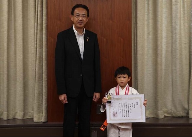 田中さんは、父親が日本拳法の経験者であることや兄弟が日本拳法を習っていた影響で興味を持ち、3歳の時に日本拳法白虎会(道場登録:京都府)に入門。道場での稽古に加え、父の指導を受けながら、基礎となる前拳・後拳の練習を中心に毎日稽古に励んでいて、今年5月に開催された京都府民大会・小学1年生の部で見事優勝を果たすなどの実績を残しています。令和5年11月に開催された西日本少年大会に出場した田中さんは、得意技の中段まわし蹴りを武器に28人中見事3位となり、9月15日(日曜日)に大阪府で開催される「第42回日本拳法総合選手権・少年の部」へ京都府代表として出場が決定していました。この日、市役所を訪問した田中さんは、「得意技を出し、全国大会では優勝できるように頑張ります」と出場に向けた意気込みを話し、濱田市長は「悔いのない試合になることをお祈りしています」と激励しました。