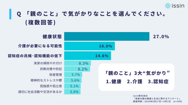お風呂上がりに乗るだけで体重測定できるバスマット「スマートバスマット」や、「健康無関心層」に効果的にアプローチする生活習慣改善サービス「スマートデイリー」などを展開する、東京大学発のヘルスケアスタートアップissin株式会社(本社:東京都文京区 代表取締役:程 涛、読み:イッシン、以下「issin」)は、この度5万人を超えた「スマートバスマット」のユーザー(20代~70代の男女598名)を対象に、「高齢の親の健康と生活に関する調査」を実施しました。