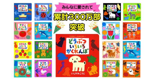 2022年、シリーズ第1作『どうぶついろいろかくれんぼ』が100万部を越え、日本国内で累計100万部以上発行された絵本のみ掲載される「ミリオンぶっく」(発行:取次会社トーハン)に仲間入りをいたしました。「ミリオンぶっく」では現在135冊紹介されており、135冊のうち2005年以降に刊行された書籍は10冊のみです。児童書としては異例のスピードでの100万部突破し、さらに今回、シリーズとしては300万部を突破したことからも人気の高さが伺えるシリーズとなっています。