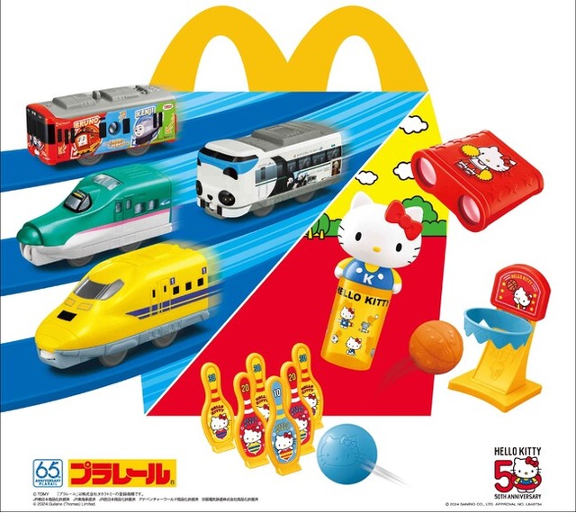 ハッピーセット「プラレール」は、株式会社タカラトミーの鉄道玩具「プラレール」の新幹線、蒸気機関車のほか、「京阪電車13000系きかんしゃトーマス号」、パンダくろしお「Smileアドベンチャートレイン」、マクドナルドオリジナルカラーのプラレール鉄道「レッドストリーム」など、全8種類とひみつのおもちゃ1種のラインアップです。自分で作ったレール上に車両を走らせる遊びが、さらに知的好奇心を刺激します。
