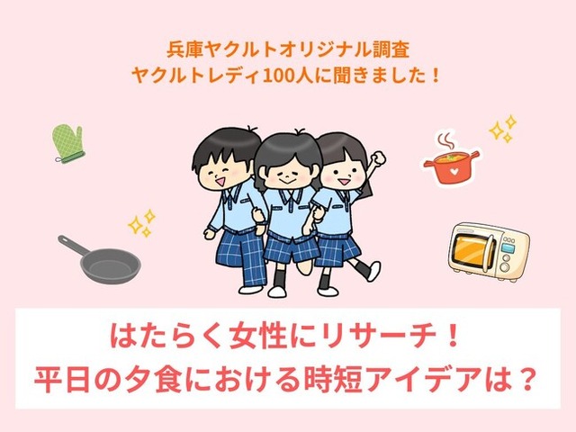 兵庫ヤクルト販売株式会社は、平日の夕食における時短アイデアについて、ヤクルトレディ146名に調査を実施。夕食作りに「毎日」取り組んでいると回答したヤクルトレディは全体の8割以上を占めていた。夕食作りにかける時間は「30分~1時間未満」が最も多く、7割を占めており、「30分未満」の回答は1割未満となった。短縮したい工程は、「下準備」「調理」も一定数あったが、半数近くが「後片付け」と回答。よく作る時短メニューについては、トッピングを変えるなどのアレンジのしやすさと、ワンプレートで済ませられることから、丼・カレー・麺類が人気を集めた。時短アイデアは、加工済みの冷凍野菜やみじん切り器などの便利グッズを活用している意見が多くあった。また夕食を作る際、重視するものとしては、「時短」のほかに「家族の好み」「栄養バランス」が上位の回答となった。