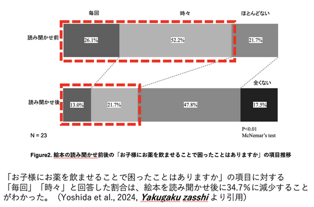 2023年3月から2024年3月にかけて、3~6歳の小児とその保護者を対象に実施されたこの研究では、絵本の読み聞かせ前後で、服薬に対する困難さを感じる保護者の割合が78.3%から34.7%に減少しました。