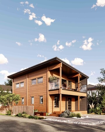 ホンカ「ストゥディオ」の外観は、シンプルな木の箱を思わせるデザイン。片流れの大きな尚が特徴です。