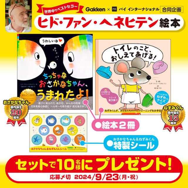 株式会社 学研ホールディングス(東京・品川/代表取締役社長:宮原博昭)のグループ会社、株式会社 Gakken(東京・品川/代表取締役社長:五郎丸 徹)は、株式会社パイ インターナショナル(東京・豊島/代表取締役社長:三芳 寛要)と合同で、2024年9月13日(金)より、ヒド・ファン・ヘネヒテン著作絵本合同キャンペーンをSNSにて開催いたします。また、一部書店では合同フェアも開催中です。