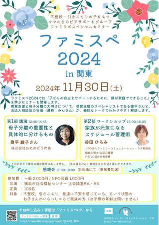 NPO法人ファミリーコミュニケーション・ラボ(所在地:大阪市天王寺区、代表者:鈴木典子、以下「ファミラボ」)は、2024年11月30日(土)横浜市にて、不登校、引きこもり、発達に不安を感じている、という状態のお子さんの家族を対象に、第12回ファミラボ全国大会「ファミスペ2024 in 関東」を開催します。