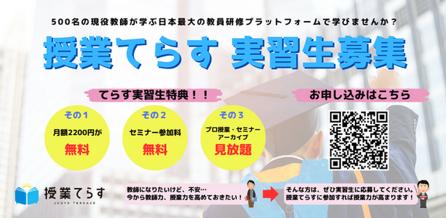 教師へのわくわく感を抱きながら、授業力を高めた教師が現場で1年目からいきいきと働く。全国の多くの仲間と支え合うことで切磋琢磨しながら、さらに授業力を高めていく。そんな先生方が全国の教室をHAPPYにしていき先生も子どももHAPPYになる。こんな素敵な未来が『授業てらす実習生』にはたくさん詰まっています。たくさんのご参加お待ちしています。