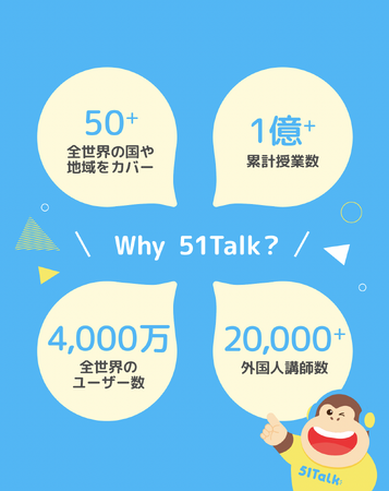 ▼株式会社51Talk Japanについて株式会社51Talk Japanは、世界最大級のグローバル英語教育テックカンパニーである51トーク・オンライン・エデュケーション・グループの日本法人です。51トーク・オンライン・エデュケーション・グループは世界(5つの大陸)を1つの言語でつなぐことを目指し、「世界と話せる能力を全ての人に」の理念の下、アジアを中心に50か国にオンライン英語学習プラットフォーム「51Talk」を提供、約4,000万人のユーザーを有しています。2016年にはニューヨーク証券取引所にアジア発のオンライン英語教育企業として初めて上場。また、「51Talk」はHRDC(人材開発評議会)から英語研修機関としての認定、世界最大級の受験数を誇る英語運用能力評価試験「IELTS」の認定を受けている他、マレーシア教育省の厳しい基準を満たした英語教育機関として入学許可を取得しています。