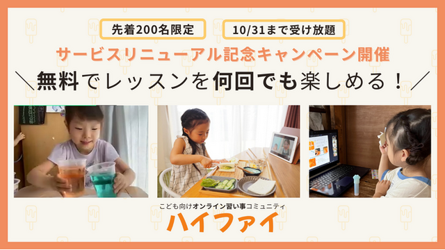 ハイファイは、こども向けに40種類以上のオンライン習い事をわずか月額6,250円で提供しています。毎日開催されるレッスンに受け放題で、家庭や保育園に続く【第三の居場所】としてこどもたち、そして子育て家庭をサポートします。無料会員登録をすると、月2回レッスンを無料で体験することが可能です。