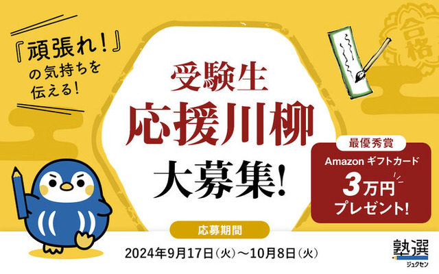 今回は志望校合格を目指して頑張る受験生のみなさんを応援するために、受験生応援川柳の募集を行います。応募期間は2024年9月17日(火)から2024年10月8日(火)まで。最優秀賞の賞品にはAmazonギフトカード3万円をご用意しています。企画にご賛同いただける方はどなたでもご応募いただけますので、ぜひご参加ください。