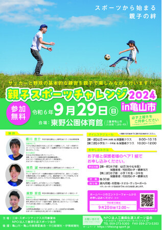 特定非営利活動法人三重県生涯スポーツ協会(三重県津市、理事長 竹田昌平)は、亀山市の東野公園体育館におきまして「親子スポーツチャレンジ2024in亀山市」を開催します。