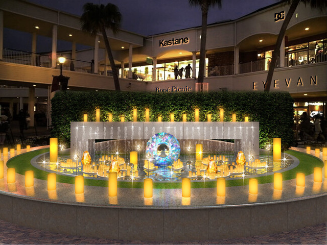 りんくうプレミアム・アウトレットの噴水に、カメヤマの400本以上の大小のLEDキャンドルと、幻想的なアイアンオブジェが登場し、水面に光るキャンドルの灯りと洗練されたオブジェのマリアージュがアウトレットの夜を幻想的に彩ります。