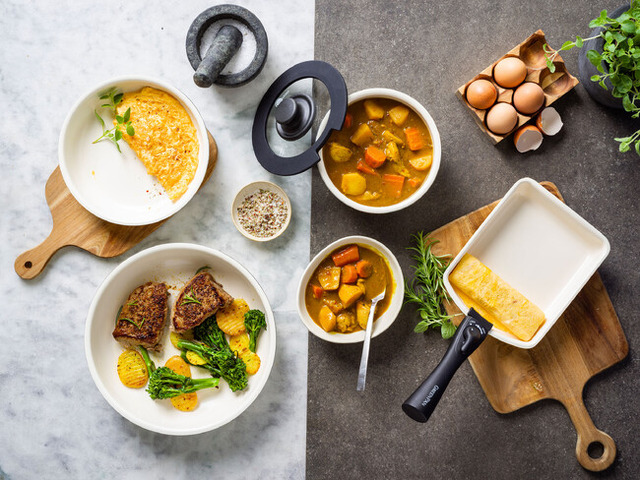 セット品のラインナップには無かった「ソースパン 20cm」「ガラス蓋 20cm、26cm」「シール蓋 22cm」が新たに登場。料理の幅が広がります。