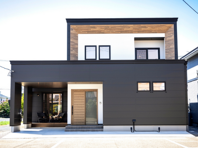 今回オープンするアイフルホーム弘前店は、「イマドキ家族の家」をコンセプトに、モノトーンの外壁に木目を合わせた洗練されたデザインと開放的で家族や仲間が集える空間を提案しつつ、プライベート空間にもこだわった住まいとして建築しました。