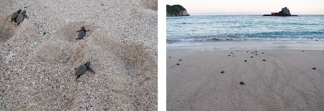 鴨川シーワールドでは、ふ化に適さない場所でウミガメの産卵があった場合や台風の接近等により卵に危険が及んだ場合に、その卵を「ウミガメの浜」に保護収容し、生まれた子ガメを海に放流しています。今回旅立ったアカウミガメの子ガメは、7月24日に守谷海岸で産卵を確認した卵からふ化した個体です。台風7号の接近を懸念した地元市民から勝浦市役所の担当者を通して8月15日に要請があり、そのままでは卵に危険がおよぶ恐れがあると判断したため、同日の夕方に137個の卵を「ウミガメの浜」に保護しました。