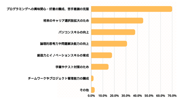利用目的の7割は「プログラミングへの興味関心・好意の醸成、苦手意識の克服」でした。
