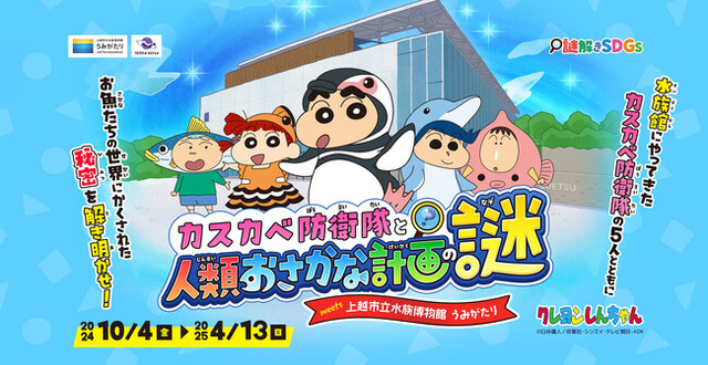 上越市立水族博物館『うみがたり』では、令和6年10月4日(金)~令和7年4月13日(日)の期間、漫画やアニメで大人気の作品である『クレヨンしんちゃん』とコラボレーションし、海の生きものをテーマにした謎解きイベント「カスカベ防衛隊と人類おさかな計画の謎meets上越市立水族博物館 うみがたり」を開催します。