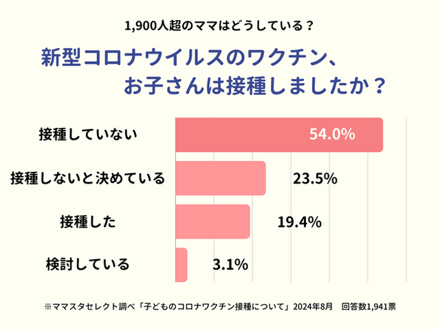 2024年4月以降、新型コロナワクチンの接種は努力義務や自治体からの推奨の規定はなくなりました(※)。これを受けてママスタセレクトでは「新型コロナウイルスのワクチンをお子さんは接種しましたか?」というアンケートを実施。選択肢に「接種した」「接種していない」「検討している」「接種しないと決めている」の4つを設定したところ、1,900人を超えるママたちから回答を得ることができました。
