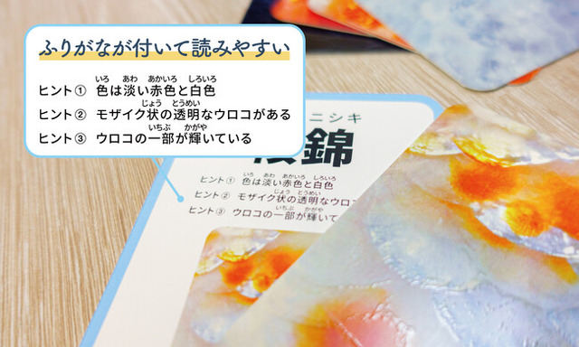 視力が悪いお年寄りや小さなお子さまなどルール次第で皆で遊べて、魚の漢字や雑学を学ぶこともできます。