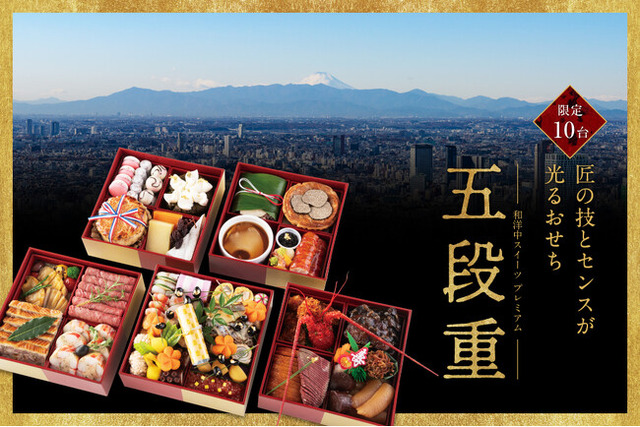 セルリアンタワー東急ホテル(東京都渋谷区、総支配人 武井 隆)では、2025年の新春を寿ぐお祝い重「和洋中スイーツ プレミアム五段重」を1台170,000円(配送料、消費税込)にて販売いたします。ホテルより90分圏内のご自宅までホテルスタッフがお届けいたします。