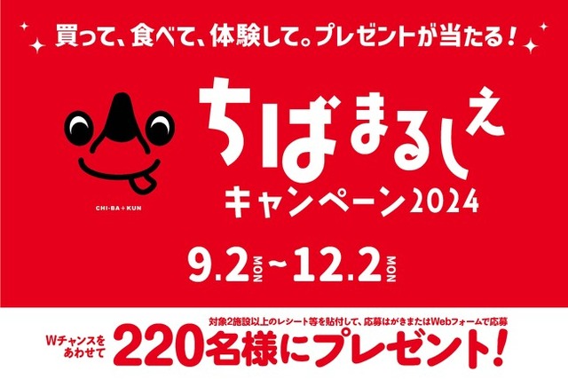 2024年9月2日(月)から12月2日(月)まで、キャンペーン対象2施設以上でお買い物、体験等をしたレシート等を参加施設にある専用応募はがきに貼付、またはキャンペーン特設Webページの応募フォームで画像添付して、お好きな賞品に応募できます。応募された方の中から抽選で220名様に、ペア宿泊券や千葉県産農林水産物等の自慢の産品などをプレゼント提供します。さらに施設周遊特典として、10施設分のレシート等をまとめて応募すると当選確率が25倍(※)になります。