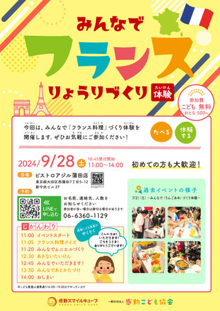 一般社団法人 感動こども協会(所在地:東京都新宿区、以下、当協会)の正会員である感動こども食堂「ビストロアジル 蒲田店」にて、2024年9月28日(土曜日)にイベント『みんなでフランス料理づくり体験 』を開催します。