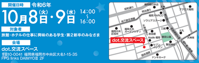 大分県の宿泊企業が、学生、第2新卒者を対象に、旅館やホテルならではの魅力発信を、福岡市中央区大名のカフェで開催する。通常の企業説明会と異なり、交流会形式で緊張なく気軽な雰囲気の中で行う。