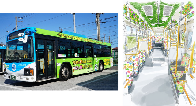 < 全国都市緑化かわさきフェアコラボラッピングバスと車内装飾のイメージ >