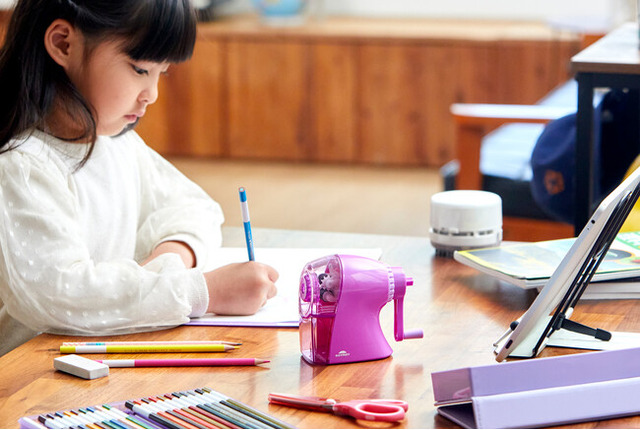 手動鉛筆削り ケズルトンは、一般的な手動鉛筆削りより一回りコンパクトな丸みのあるデザインで、リビング学習にも最適な手動削りです。