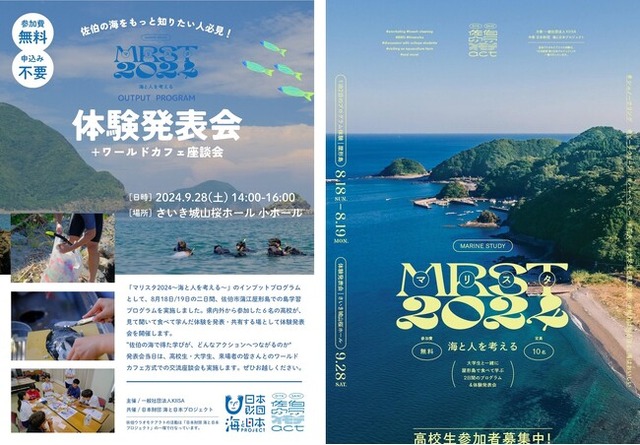 一般社団法人KIISAは、2024年9月28日(土)にマリスタ2024 ~海と人を考える~「体験発表会+ワールドカフェ」を開催いたします。2024年8月18日(日)~19日(月)1泊2日の屋形島での体験学習に参加した高校生6名が学び体験したことを発表・共有する場として体験発表会を実施します。