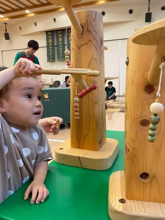 能登で被災地支援イベントを行うのは今回で3回目。赤ちゃんから高齢者まで参加費無料で、市外からも参加者が訪れます。会場は木のおもちゃがあふれ、やさしい木の音色と子どもたちの笑い声が終日こだましていました。中には「前回(5月)もすごく楽しかった。またここで遊べてうれしい!」という小学生も。木のたまごプールに飛び込んだり、得意のけん玉で競ったり、大勢の参加者で積み上げるダイナミックな積み木ショーでは大きな歓声が上がりました。
