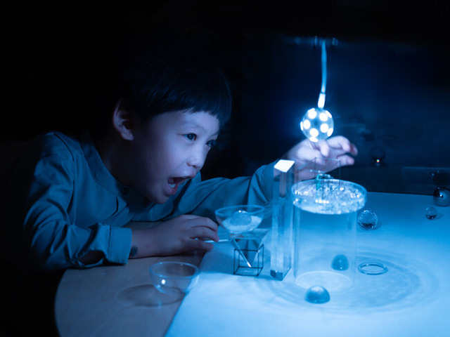 子どもたちの遊びのプロセスを重視するリゾナーレ大阪では、本プロジェクトを通して光との出会いから探究を深める活動を段階的に展開します。まずは、アルミやプリズム(*1)などの形や透過性の異なる素材と光を使い、光がもつ特性(反射・透過・屈折)の不思議さや面白さと出会います。そして、光の色や明るさの強弱を自由に変えられるILLUMMEの機能と素材を掛け合わせることで、身近にある光の新たな一面を知り、創造力を膨らませていきます。探究をサポートするアトリエリスタとともに、光と素材、色を自由自在に組み合わせ、思い思いに光の表現を展開していきます。