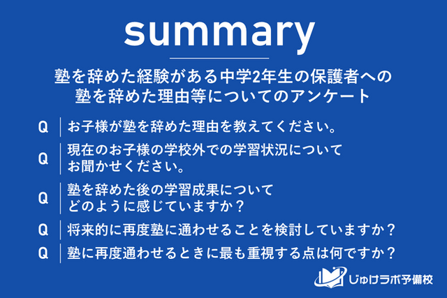 じゅけラボ予備校(所在地:大阪市北区、代表取締役:後藤智則)は、塾に過去通っていて現在は塾を利用していない中学生2年生の保護者47名を対象に、塾を辞めた理由に関する意識調査を実施しました。