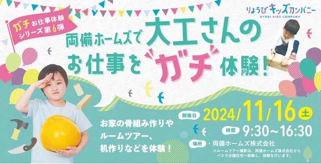 両備グループ(事務局:岡山県岡山市北区下石井二丁目10番12号 杜の街グレース オフィススクエア5階、グループ代表兼CEO:小嶋光信)は、2024年11月16日(土)に、小学生のお子様向けのお仕事体験イベント“ガチ”お仕事体験シリーズ第6弾~両備ホームズで大工さんのお仕事を“ガチ”体験~を開催することになり、10月4日(金) まで参加者を募集しますので、お知らせします。