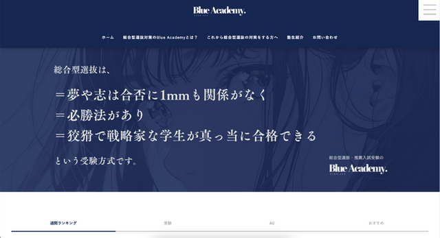 Blue Academyは、特権入試と言われている総合型選抜を“感情的なAO指導”ではなく『正解がある学術的指導』と『無駄を削ぎ落とした原価還元主義』でコスパ・タイパ最強の大学受験対策を実現する大学受験塾です。