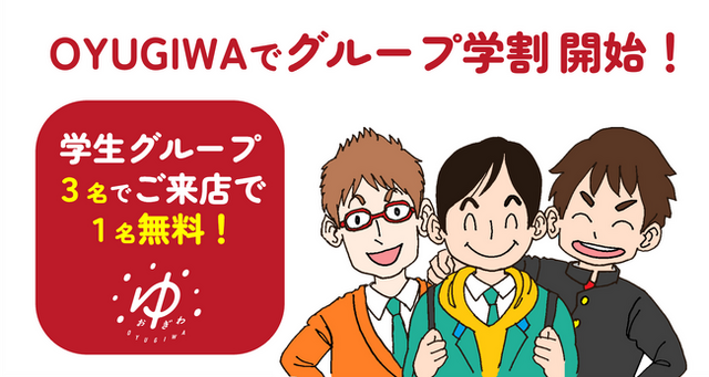 OYUGIWA 海老名、OYUGIWA 浜松市野で学生のお客さまにおすすめの「OYUGIWA グループ学割」がスタートします。中学生以上の学生グループ3名さまでご来店のお客さまは、1名さまのOYUGIWA大人(中学生以上)料金が無料になります。平日、土日祝日ともに利用できるお得な「学割」サービスです。