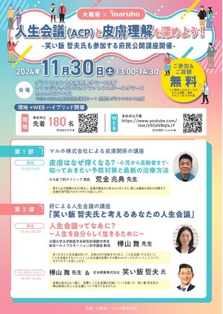 大阪府では、人生会議(ACP)の認知度を高め、より多くの皆さまに人生会議(ACP)を実践していただ くため、「人生会議の日」である11月30日に、在宅医療連携企業であるマルホ株式会社との共催で、府民向け公開講座「笑い飯 哲夫と考えるあなたの人生会議」を開催します。