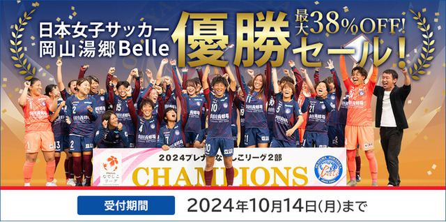 この度、岡山湯郷Belleのなでしこリーグ2部優勝・1部昇格を祝し、当社ECサイトと直営店(全14店舗)において「岡山湯郷Belle優勝キャンペーン」を実施いたします。
