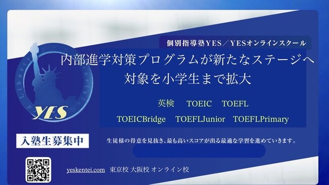 船場物産株式会社(本社:大阪府東大阪市・東京支店:東京都千代田区麹町・代表取締役:安田周平)が運営する、個別指導塾YES/YESオンラインスクールでは、かねてより英検/TOEIC/TOEFL/IELTS/TOEIC Bridge/TOEFL Junior他各種検定や定期テスト対策など、一貫校内部進学生向けプログラムにご好評を頂いております。