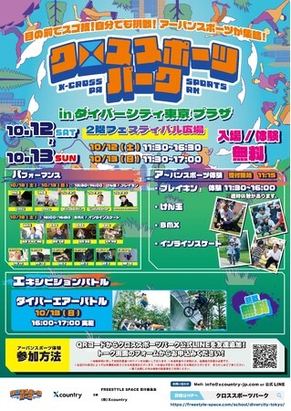 全国各地でアーバンスポーツのイベントを手がける株式会社Xcountry(東京豊島区)は、2024年10月12日(土)・13日(日)の2日間、ダイバーシティ東京 プラザにてアーバンスポーツの特別イベントを開催。ブレイキン、BMX、インラインスケートなど、ストリートスポーツの人気ジャンルが一堂に会するこのイベントでは、一般参加者が実際にスポーツを体験できるプログラムを用意。さらに、トップアスリートによるパフォーマンスショーも行われる予定だ。