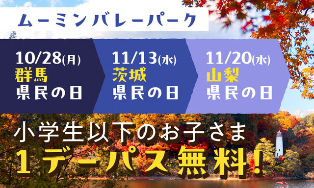 株式会社ムーミン物語(本社:埼玉県飯能市、代表取締役社長:小幡 匡志)は、10月28日(月)群馬県、11月13日(水)茨城県、11月20日(水)山梨県のそれぞれの『県民の日』当日に、各県在住の小学生以下のお子さまを1デーパス無料でムーミンバレーパークにご招待いたします。