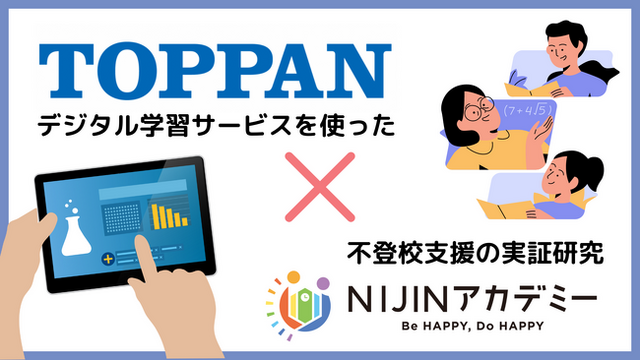 株式会社NIJIN(本社:東京都江東区、代表取締役:星野達郎、以下NIJINアカデミー)とTOPPANホールディングス株式会社(本社:東京都文京区、代表取締役社長 CEO:麿 秀晴、以下 TOPPANホールディングス)は、不登校支援におけるデジタルドリルの活用を目的とした実証研究を2024年9月27日(水)から2025年9月末までの約1年間、共同で実施することをお知らせいたします。